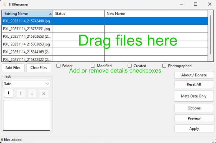 Open Windows File Explorer and drag some files to the ITR Renamer file list. You can also click the Add Files button and select them that way. To remove files, highlight them and press the delete button on your keyboard. You can add or remove file details with the checkboxes below the file list. Click on the column header to sort the files.