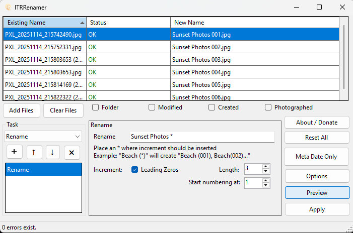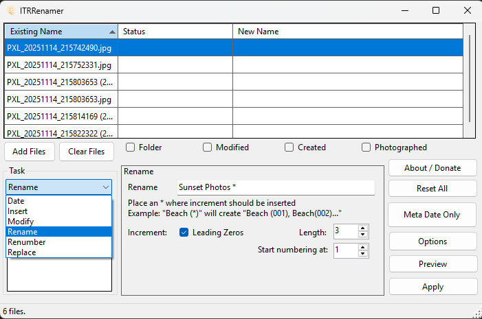 In the rename box I added a name that has meaning and an * which tells ITR Renamer where to place and increment counter. Without a counter, all the files would have the same name. Click the Preview button to see what file names will be created.